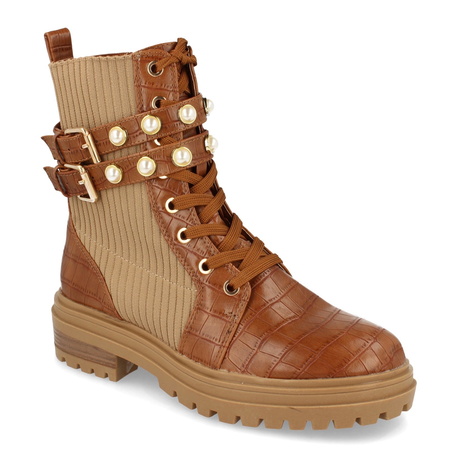 Botin de Mujer Estilo Militar Estampado de Cocodrilo Correas con Adorno y Hebilla Elastico en Tobillo y Cierre de Cordones Otoño Invierno 2020