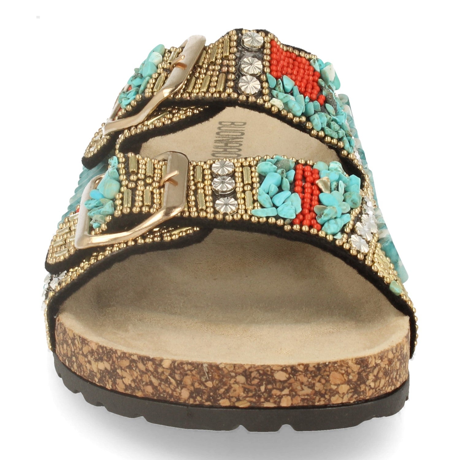 Sandalia de Mujer Plana estilo Étnico con Doble Hebilla en la Pala Adornos Metálicos Grabados Tribales y Suela Bio Confort. Primavera Verano 2020.