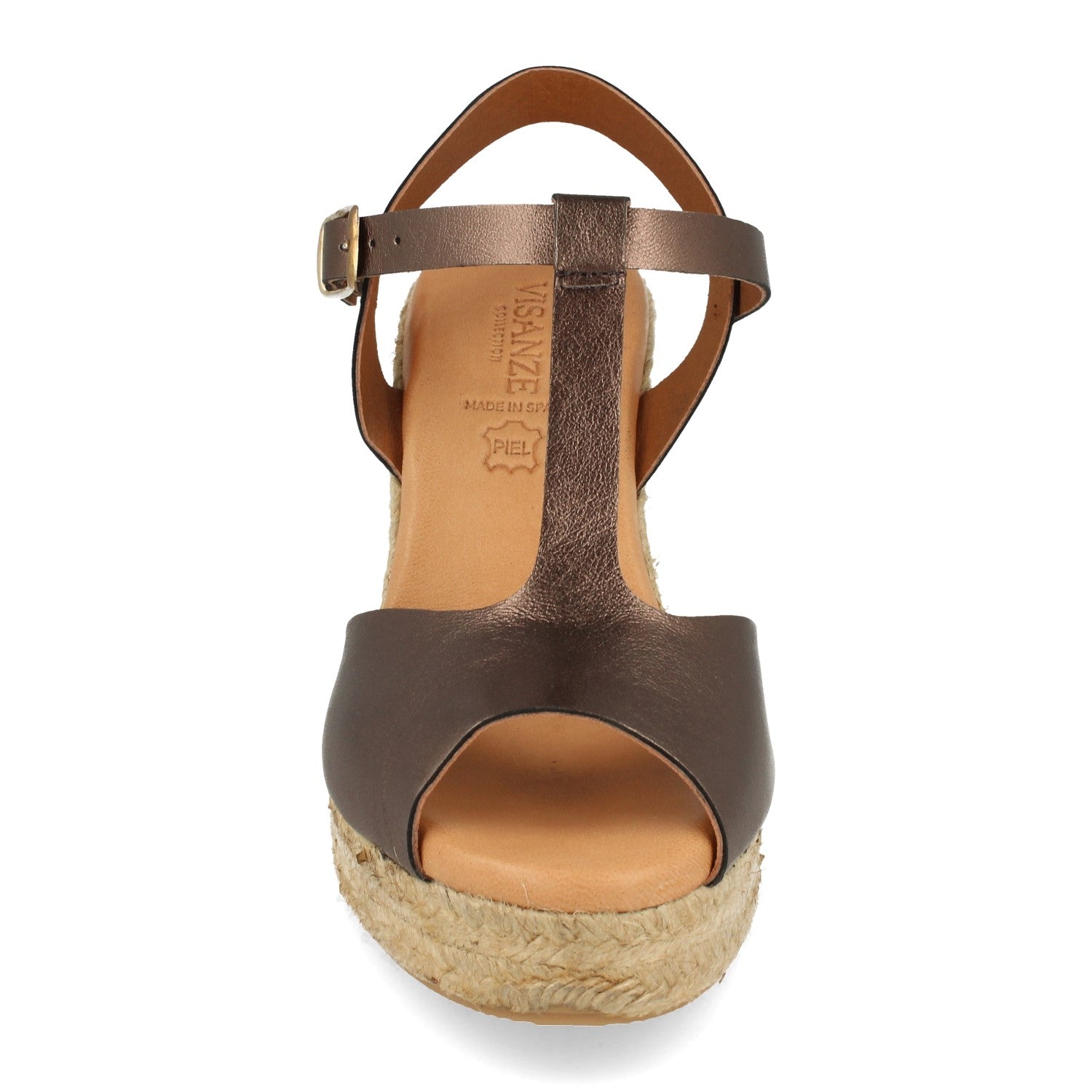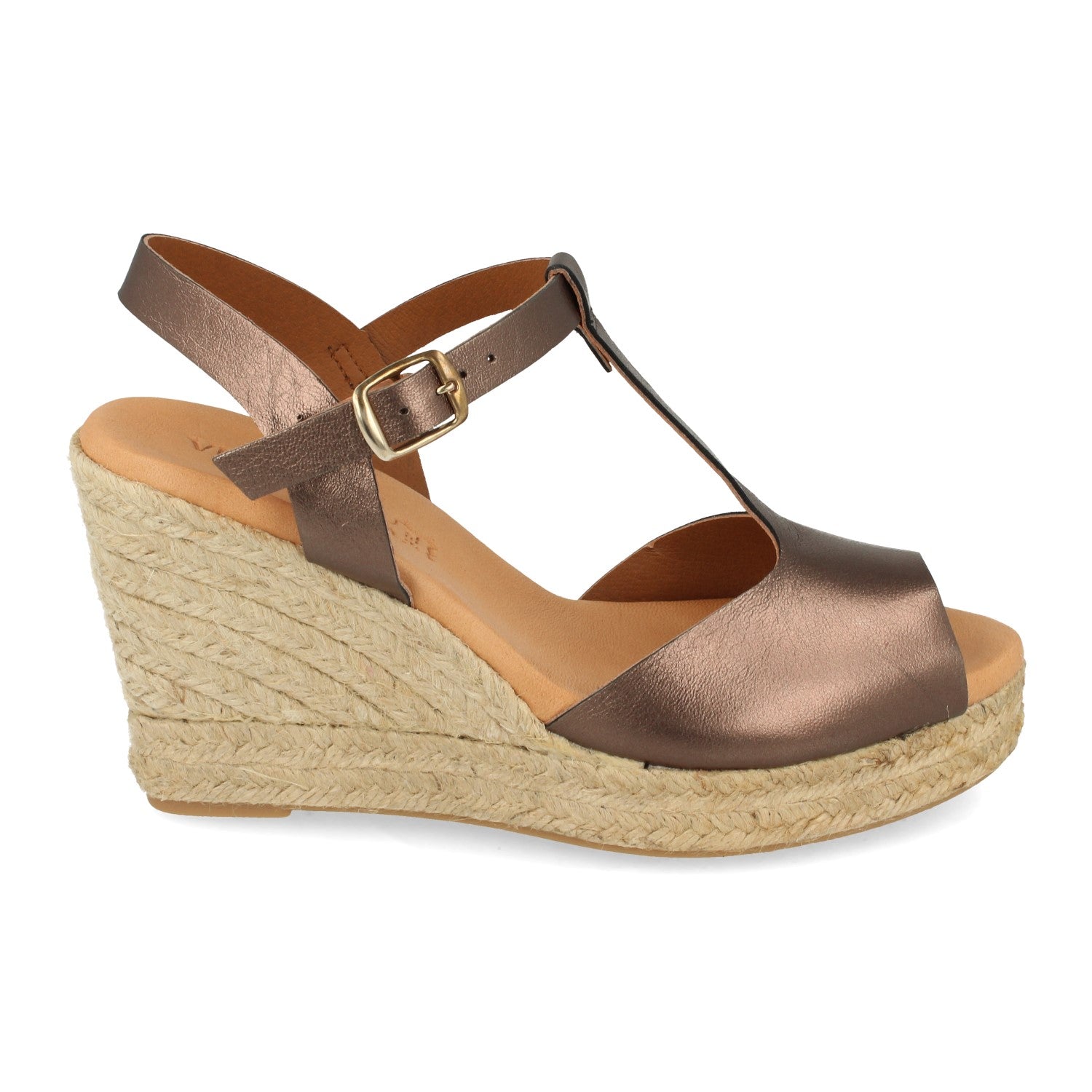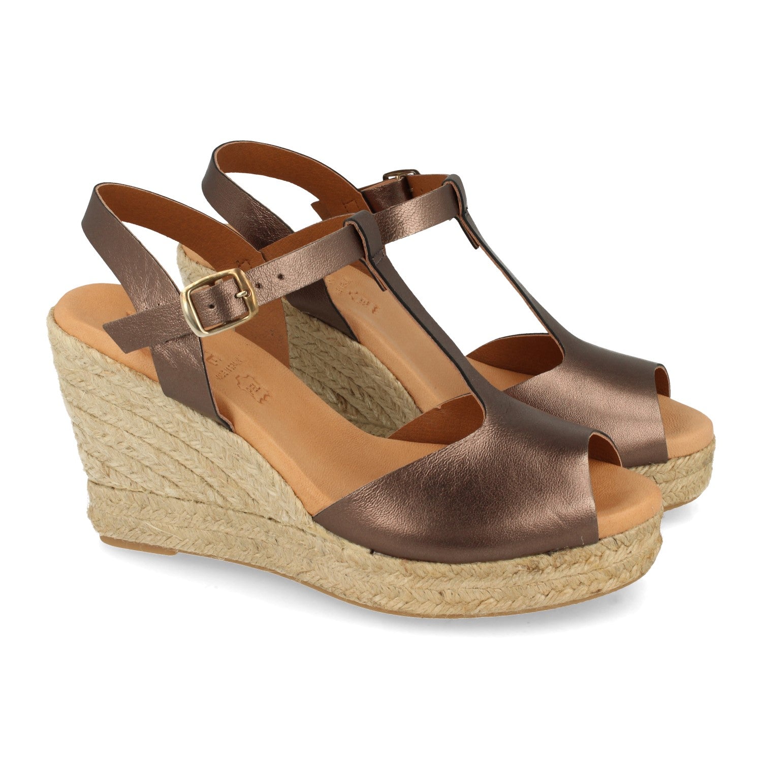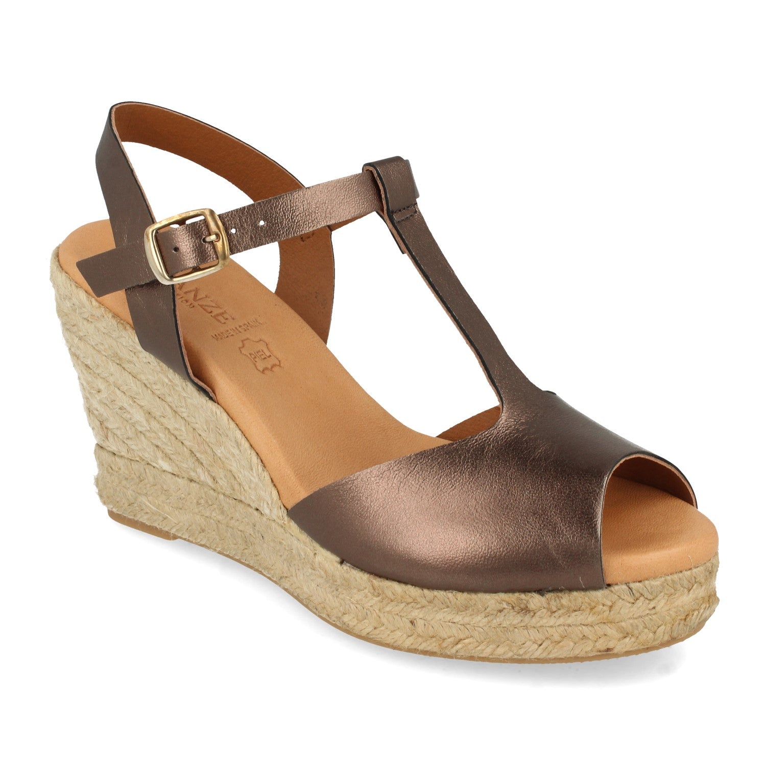 Sandalia de Cuña para Mujer Forrado con Yute Pala con Punta Abierta y en Forma de T Cierre de Hebilla Fabricado con Piel Primavera Verano 2021