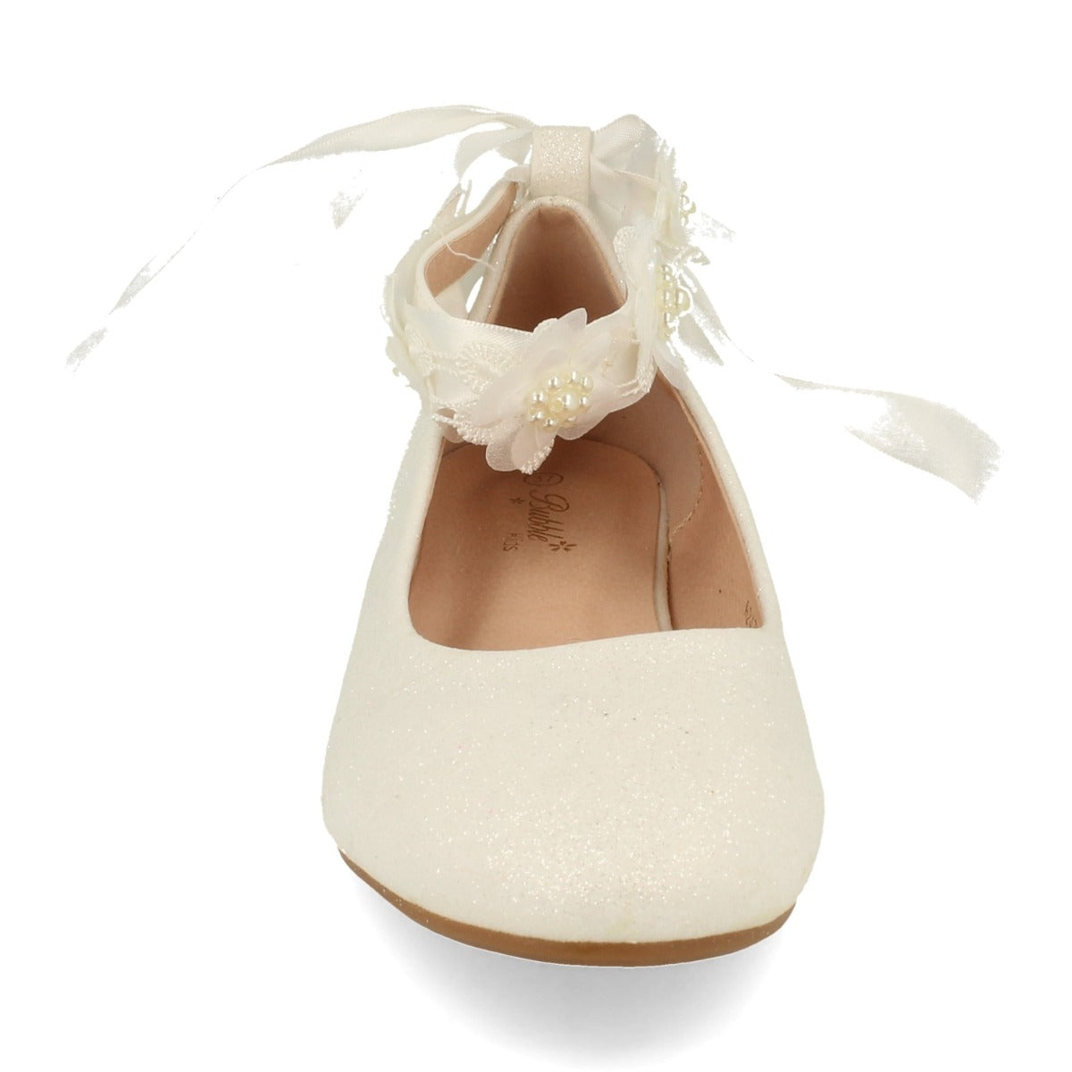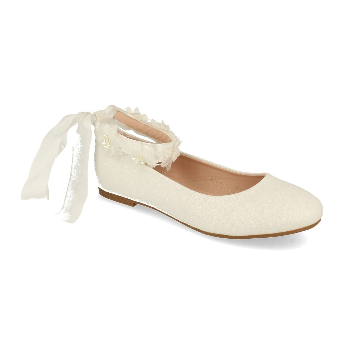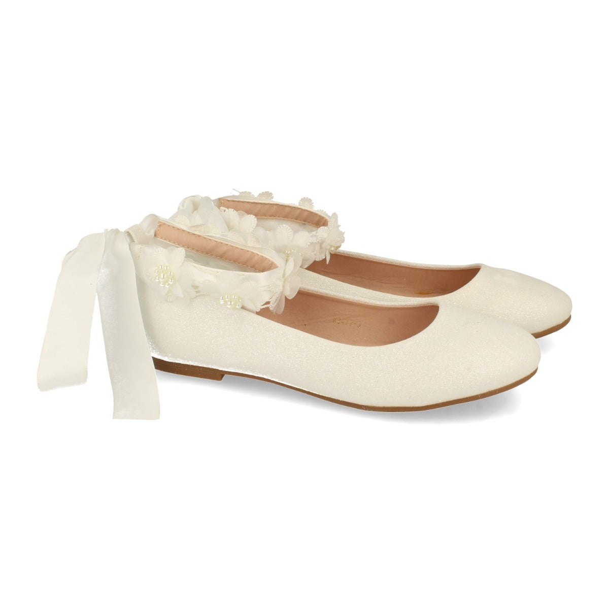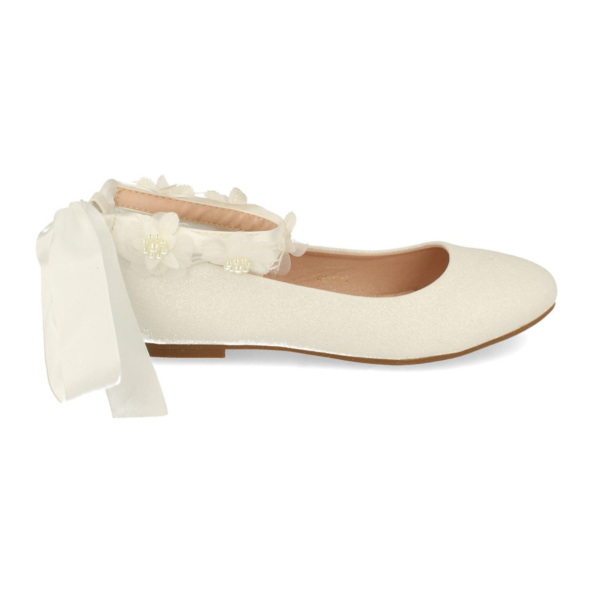 Sandalia Plana de Comunión para Niña Estilo Bailarina Decorada con Lazo y Flores Otoño Invierno 2020