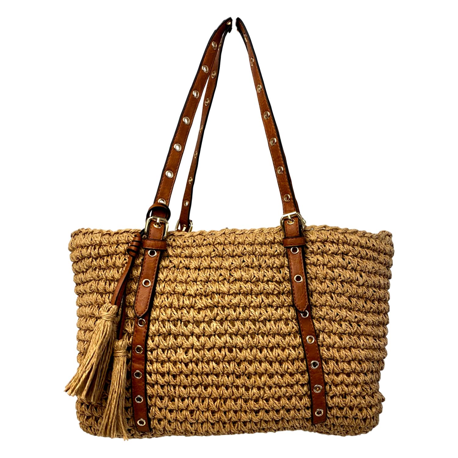 Bandolera de Rafia con Asa Ajustable Adornado con Flecos y Ojales Metalicos y Cierre de Cremallera Primavera Verano 2020